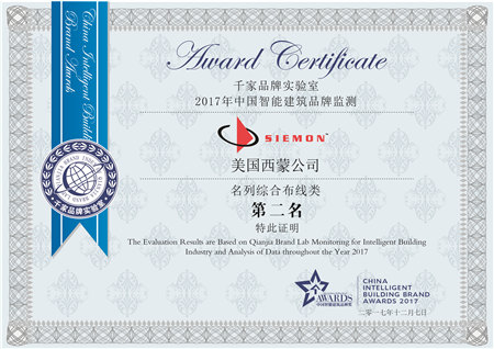 一年一度的建筑智能化行業(yè)大型盛會——2017年第十八屆中國國際建筑智能化峰會已經圓滿落幕。12月7日晚,素有智能建筑行業(yè)“奧斯卡”之稱的《中國智能建筑品牌獎》頒獎典禮在廣州東方賓館盛大舉行,本次頒獎典禮對2017年在智能建筑行業(yè)成績突出的近百家企業(yè),進行了全面的總結和表彰。擁有百年歷史的美國西蒙,蟬聯(lián)了“十大綜合布線品牌獎”第二名。