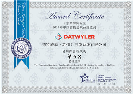 由千家智客主辦的“2017年中國智能建筑品牌獎”頒獎典禮于12月7日晚在廣州東方賓館隆重舉行。智能建筑領域重量級專家、品牌高層、業界主流媒體精英,齊聚一堂,共同見證了智能建筑行業領先企業耕耘行業一年來的榮耀收獲。素有智能建筑行業“奧斯卡”稱譽的“中國智能建筑品牌獎”再一次隆重揭曉本年度獲獎品牌,其中,百年品牌德特威勒被評選為“2017年度十大綜合布線品牌獎”第五名。