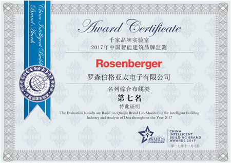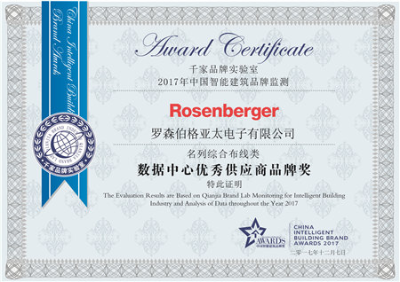 由千家智客舉辦的2017年度“中國智能建筑品牌獎“頒獎典禮于12月7日晚,在廣州東方賓館盛大舉行。現(xiàn)場大牌云集,數(shù)十位建筑智能化專家、領(lǐng)導(dǎo)以及200多位智能化品牌企業(yè)高級管理人員匯聚一堂。在這群英薈萃的時刻,見證了11個年度十大品牌獲獎名單的揭曉,共106個智能化品牌企業(yè)獲獎。羅森伯格專注耕耘行業(yè)60年,在頒獎典禮上抱回“2017年度十大綜合布線品牌獎”第七名與“2017年綜合布線數(shù)據(jù)中心優(yōu)秀供應(yīng)商品牌獎”兩座獎杯。