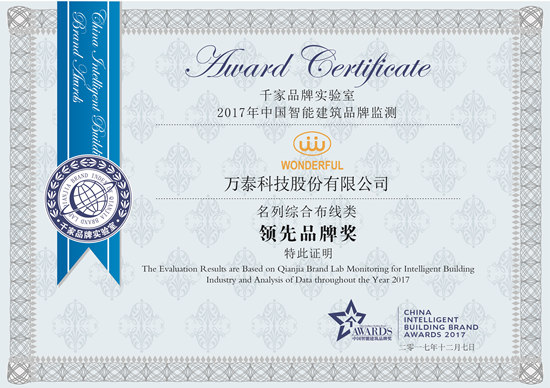 12月7日晚,由千家智客舉辦的2017年度“中國智能建筑品牌獎”頒獎典禮在廣州東方賓館盛大舉行,會上隆重揭曉了本年度智能建筑行業的各大獎項。經多方嚴格審核評選,萬泰科技榮獲“2017年綜合布線領先品牌獎”。