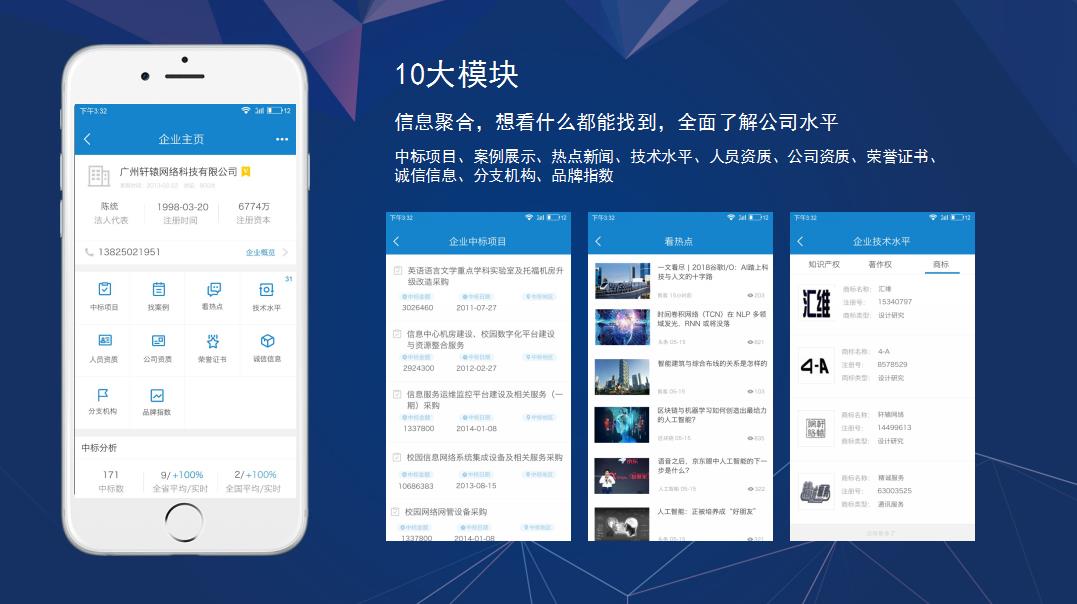 搜索到想要的公司之后,可進入公司主頁查看公司簡介、工商信息,以及中標項目、案例展示、熱點新聞、技術水平、人員資質、公司資質、榮譽證書、誠信信息、分支機構、品牌指數10大模塊內容對公司進行進一步了解。