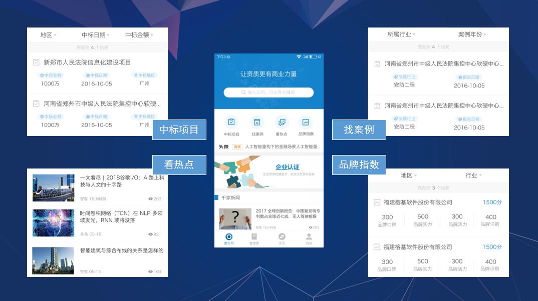 可按省市區域、資質類型對全國22萬家系統集成商進行檢索查詢,并支持模糊查找;可按省市區域、行業分類查詢中標項目案例的情況,并支持模糊查找。