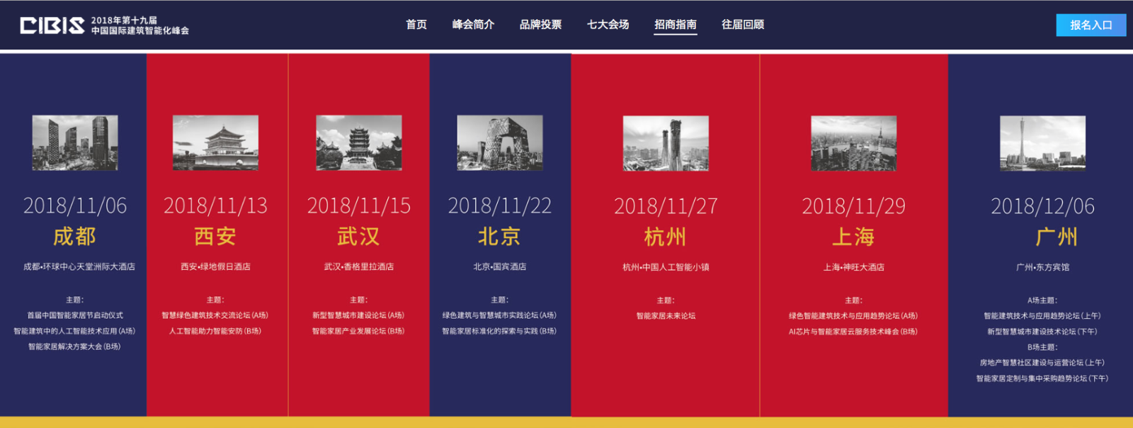 ? ? ?由千家智客舉辦的“中國國際建筑智能化峰會”是智能建筑行業每年一度的國際性盛會,被譽為智能建筑行業第一盛會,至今已有18年的歷史。峰會每年在北京、上海、廣州、深圳、杭州、武漢、成都、西安等全國重點城市舉辦,通過品牌演講、現場展示、高端專訪等形式,每年吸引全國各地行業專家、設計院人士、系統集成商、渠道商、廠商、終端用戶等逾5000人參加。?
