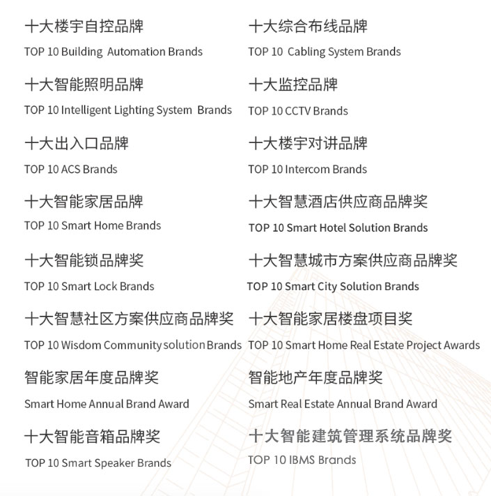 ? ? ?中國國際建筑智能化峰會舉辦期間,同時舉辦中國智能建筑品牌獎頒典禮。將頒發十大綜合布線品牌獎、十大樓宇自控品牌獎、十大智能照明品牌獎、十大出入品控制品牌獎、十大監控系統品牌獎、十大樓宇對講品牌獎、十大智能家居品牌獎、十大智能音箱品牌獎、十大智慧社區供應商品牌獎、十大智慧酒店供應商品牌獎、十大智慧城市方案供應商品牌獎、十大智能建筑管理系統品牌獎、十大智能房地產商品牌獎、十大智能家居樓盤項。由行業專家一一向獲獎品牌頒發獎杯和獲獎證書。